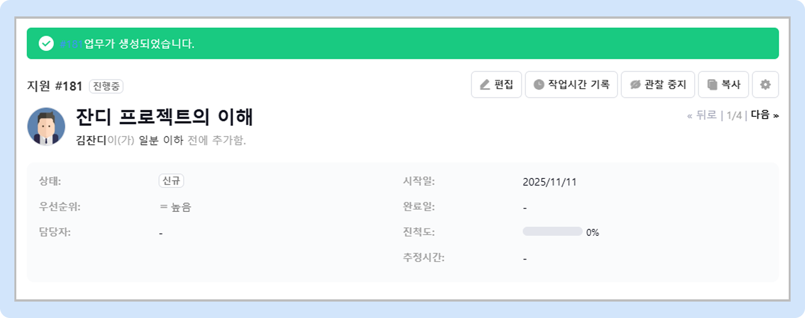 유형 | 어떤 종류의 업무인지 선택 (새 기능, 지원, 결함 등) |