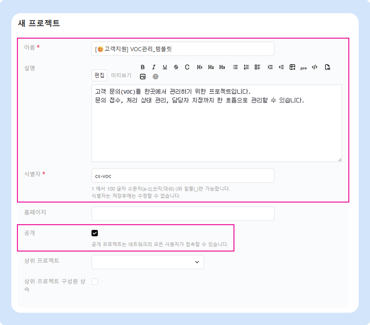 상위 프로젝트 | 다른 프로젝트의 하위 프로젝트로 생성 가능 |