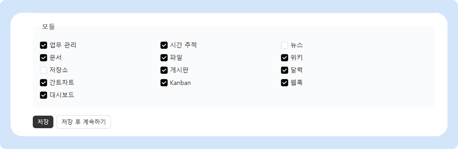 모듈 | 프로젝트에서 사용할 메뉴 선택 (수정 가능) 👉 자세히보기 |