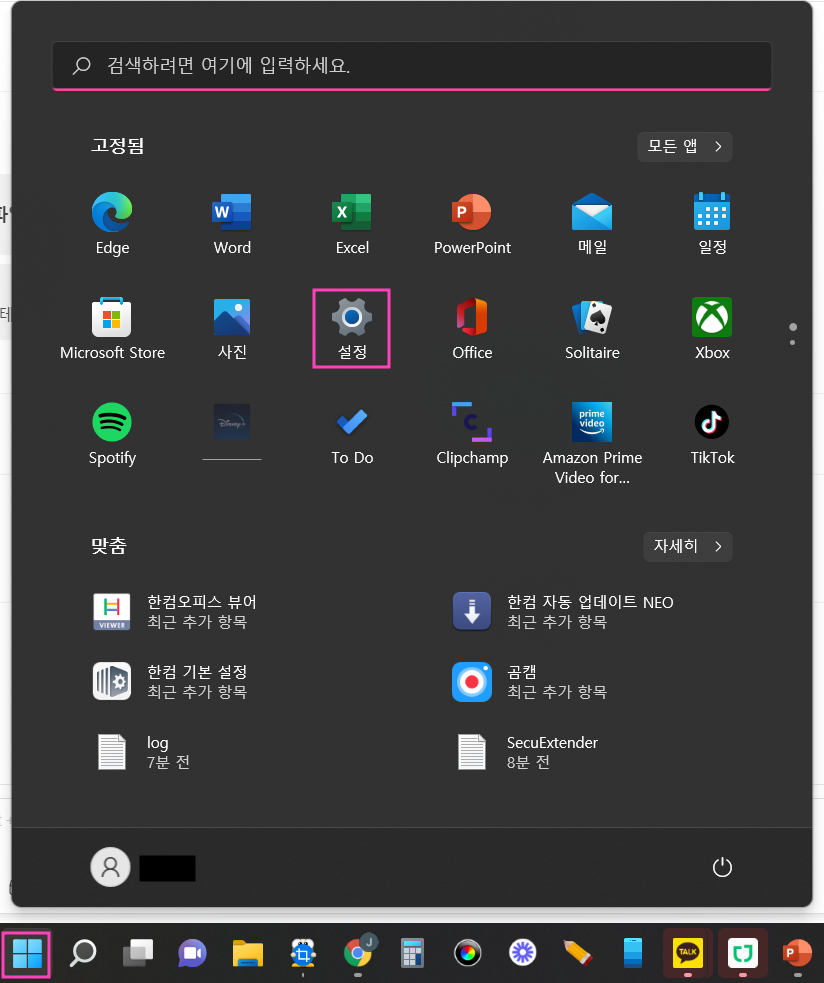 [윈도우] 아이콘을 클릭하고 [설정] 버튼을 클릭합니다.