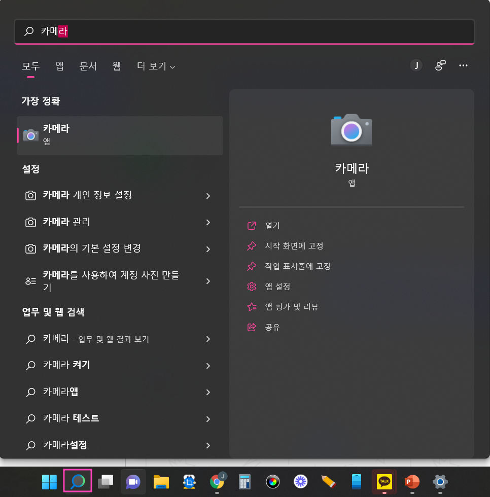 [돋보기] 버튼 클릭 후 [카메라] 입력하여 실행합니다.