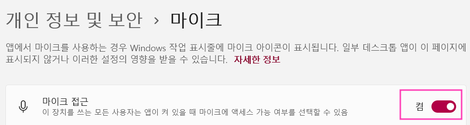 [윈도우] 아이콘을 클릭 > [설정] 버튼을 클릭 > [개인정보설정] 클릭 > [마이크] 클릭 > 마이크 접근 권한이 [켬]으로 되어있는지 확인합니다.