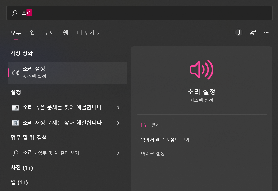 [돋보기] 를 클릭 > '소리' 검색 > [소리 설정] 클릭