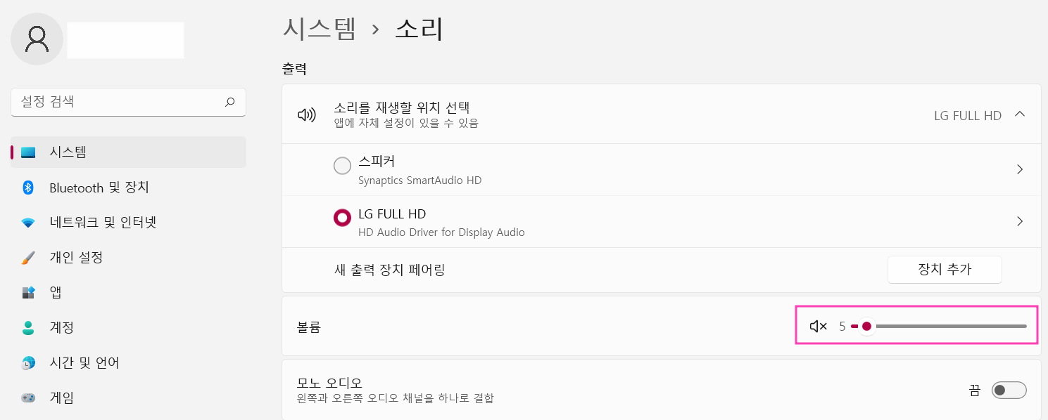 [소리 설정]탭 클릭 ▶ 볼륨 확인