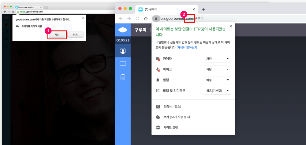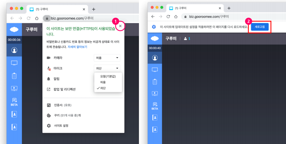 <“카메라와 마이크 사용”을 차단 해제하는 방법> “카메라와 마이크 사용”에서 차단을 클릭하신 경우 주소 표시줄 왼쪽 자물쇠 아이콘을 클릭합니다.
