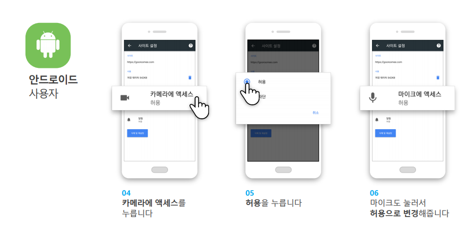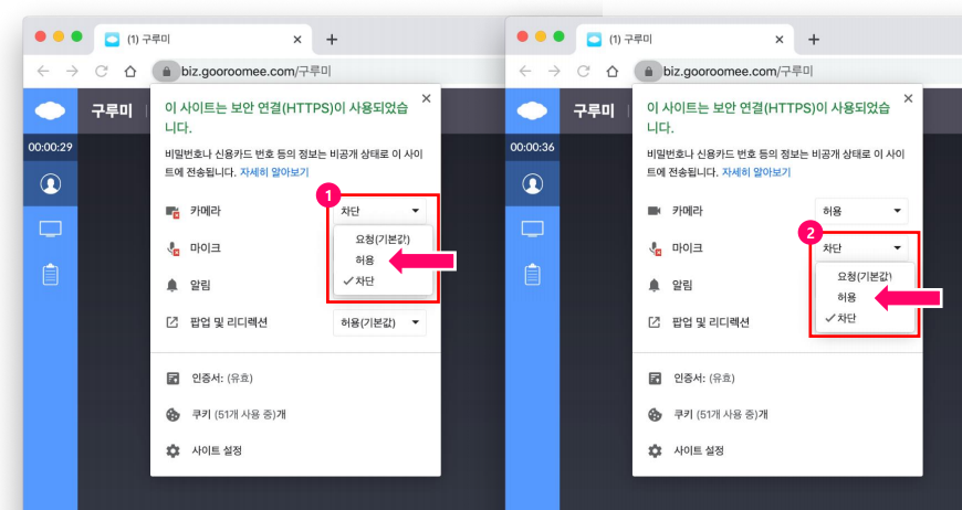 카메라 항목과 마이크 항목에 값을 [허용]으로 변경합니다.