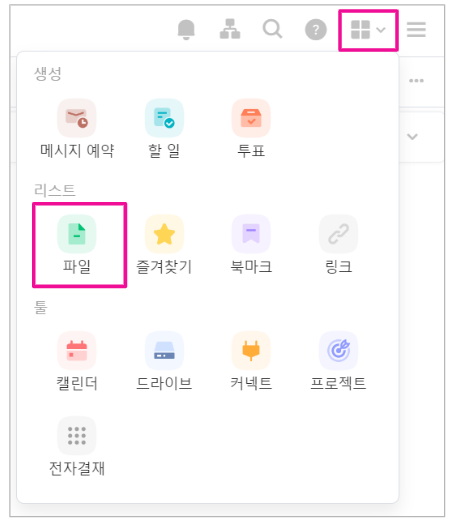 1. 잔디 창 상단 메뉴바에 [파일]아이콘을 클릭하면 업로드한 파일 목록이 표시됩니다.