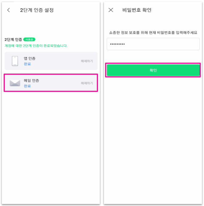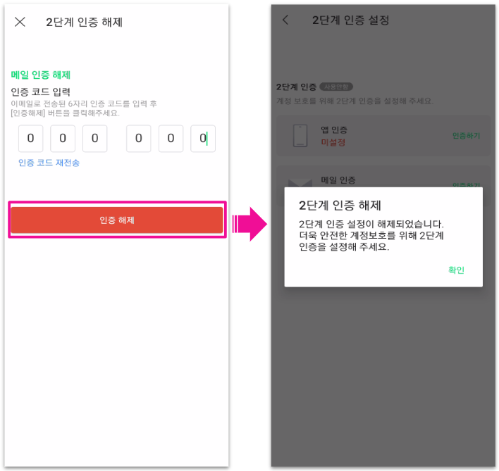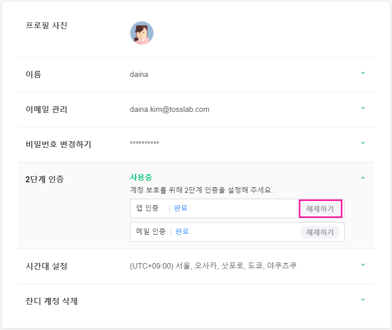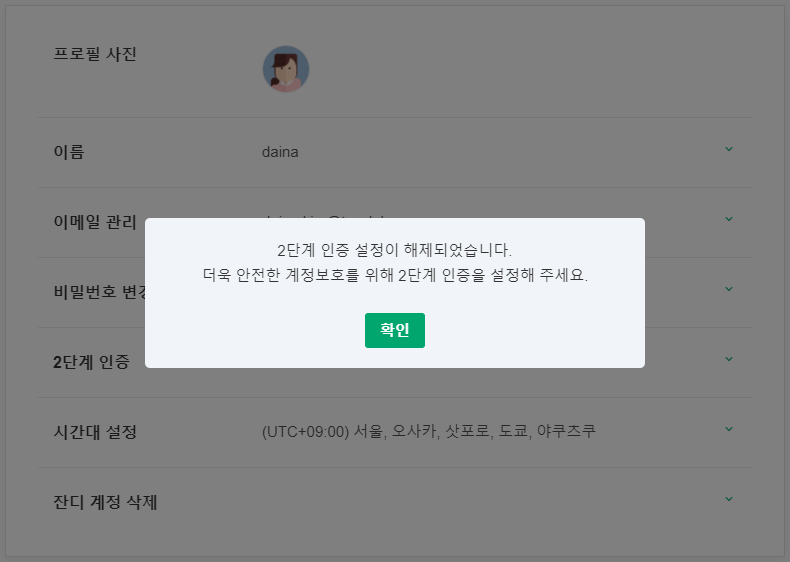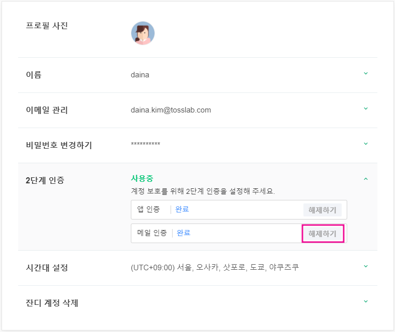 1. 계정 설정 내 [2단계 인증] > 메일 인증 옆 [해제하기]를 눌러주세요.
