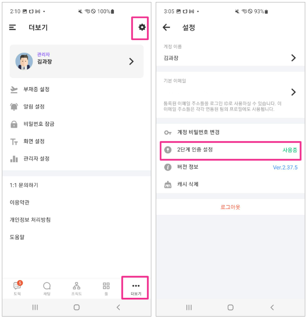 모바일 앱 우측 하단 [...] 더보기 > 상단의 계정 > [2단계 인증] 페이지로 넘어갑니다.