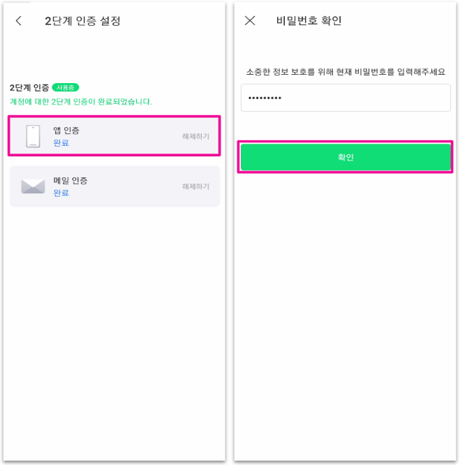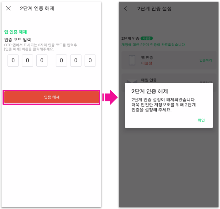 1. 계정 설정 내 [2단계 인증] > 앱 인증 옆 [해제하기]를 눌러주세요.
