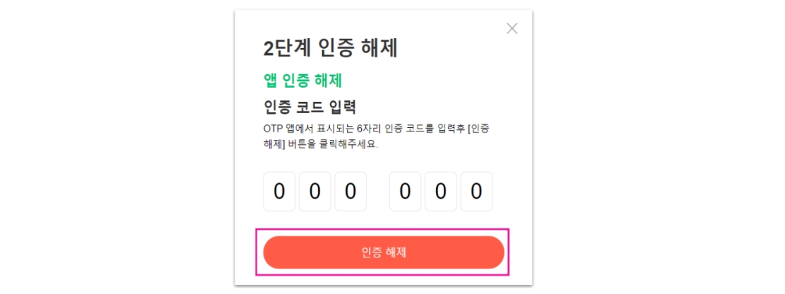 3. 모바일 OTP앱에서 보여지는 6자리 인증코드를 입력 후, [인증 해제] 해주세요.