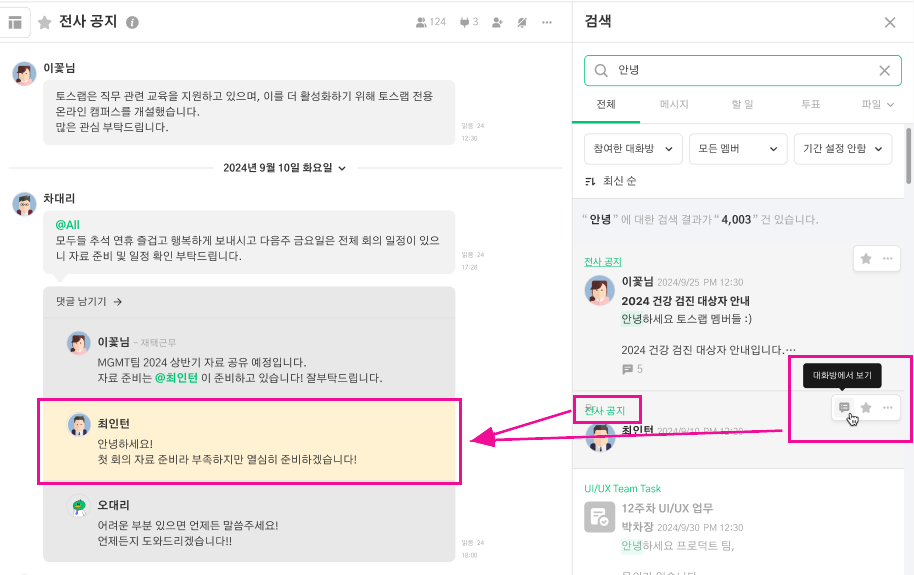 사용 방법 : 메시지 마우스 호버 > [대화방에서 보기] or 대화방 명 클릭