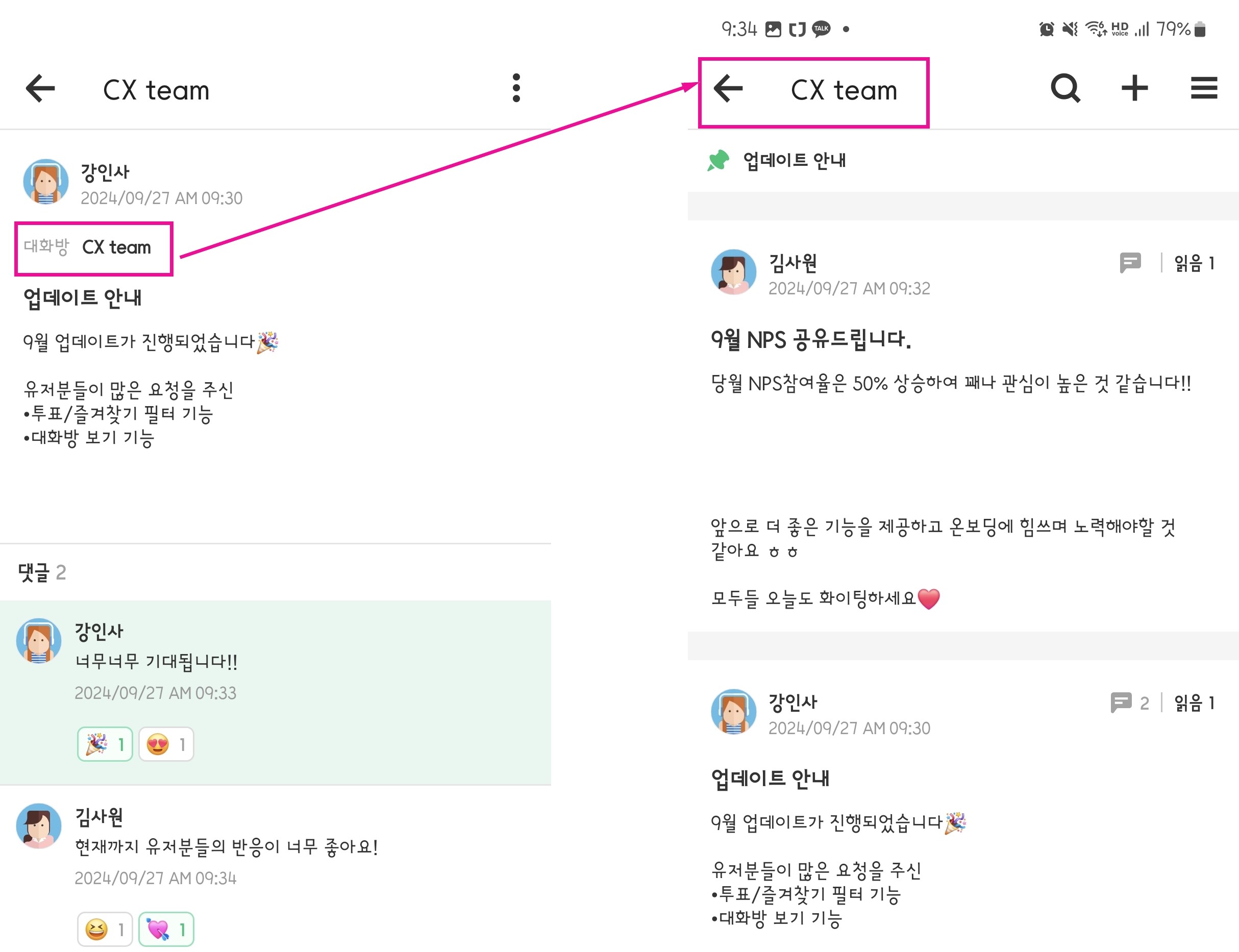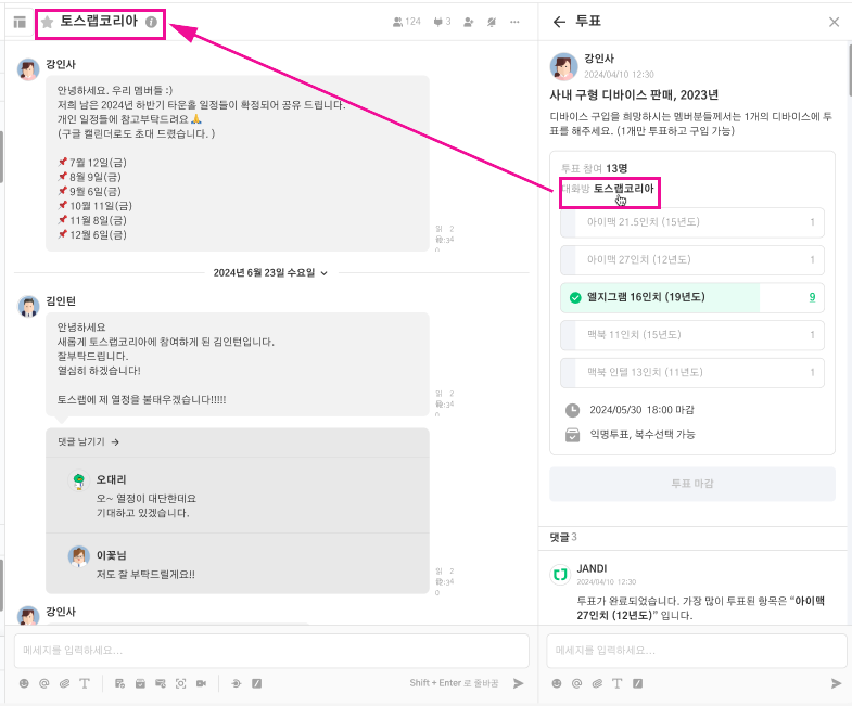 메시지, 투표, 할 일의 디테일 뷰에서 대화방으로 이동하는 기능 추가되었습니다.