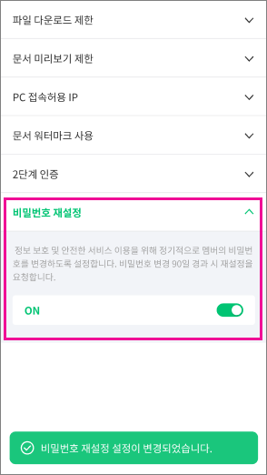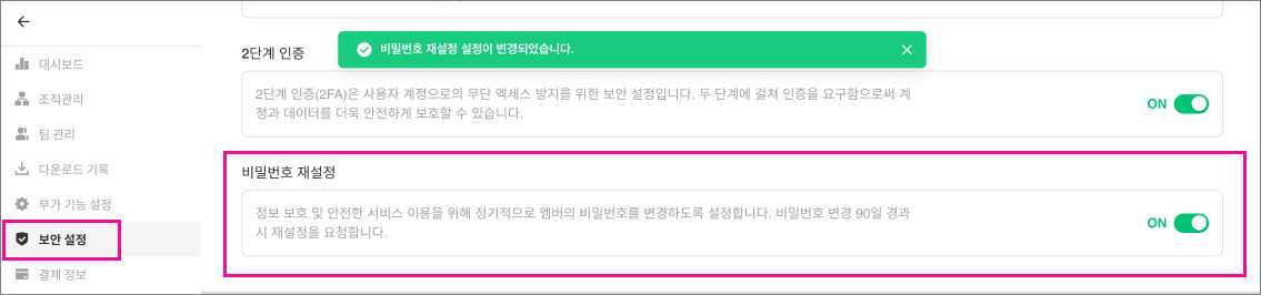 2. [보안 설정] > [비밀번호 재설정]을 [ON]으로 활성화해주세요.