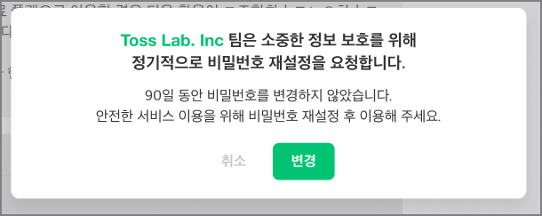 비밀번호 재설정 기능이 활성화되면, 계정 비밀번호 변경 이력이 없거나 변경한 지 90일을 초과한 멤버가 팀에 진입할 때 아래 이미지와 같이 비밀번호 재설정을 요청합니다.
