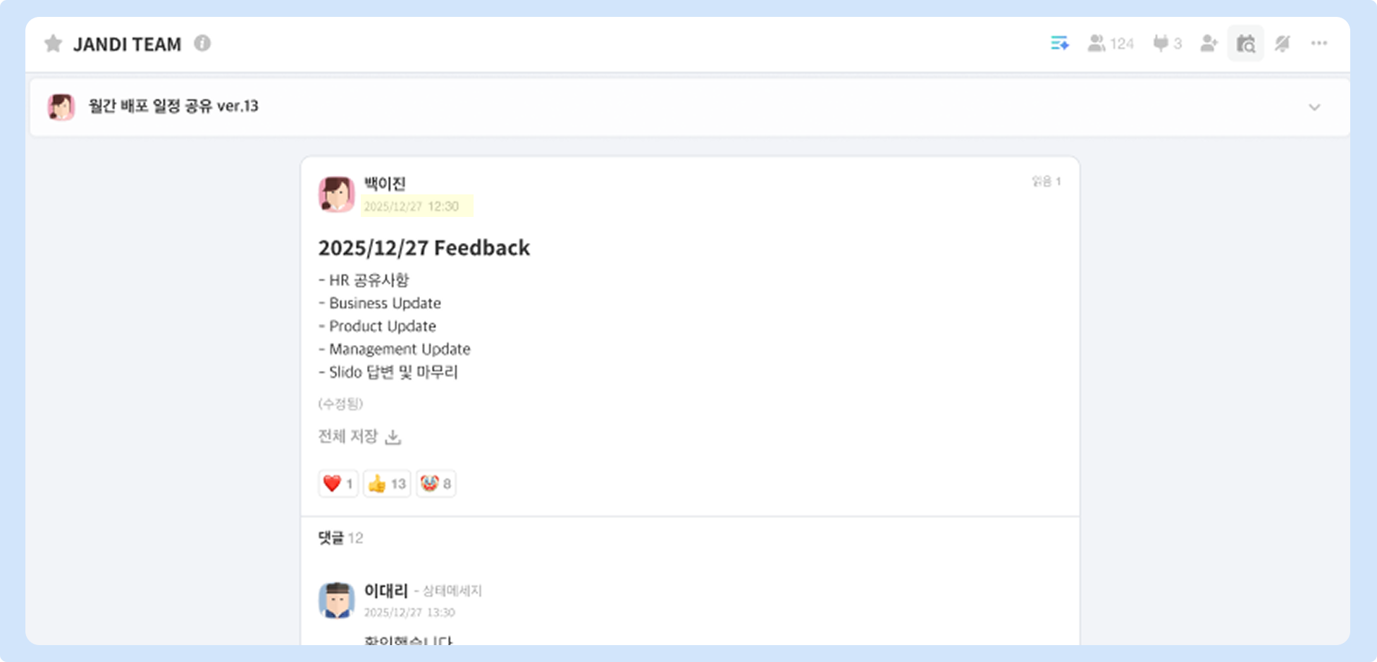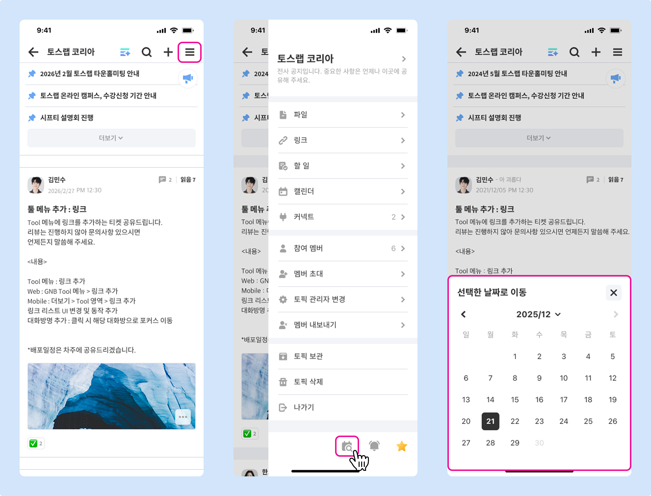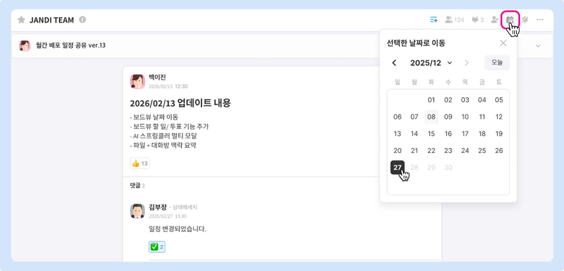 대화방 내 수많은 메시지 중, 특정 시점의 대화나 업무 기록으로 즉시 이동할 수 있는 기능입니다. 일일이 스크롤을 올려 과거 기록을 찾을 필요 없이, 달력에서 날짜를 선택하는 것만으로 당시의 맥락을 빠르게 확인할 수 있습니다.