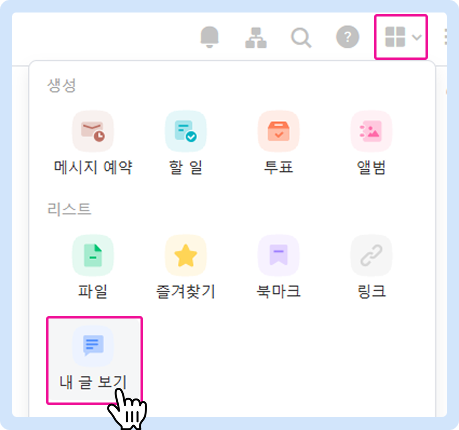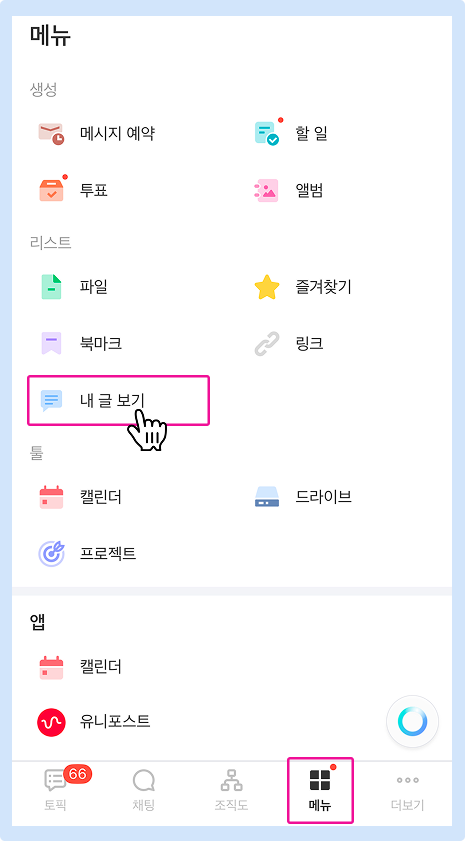 메뉴 패널 하단 리스트 영역에서 '내 글 보기'를 클릭합니다.