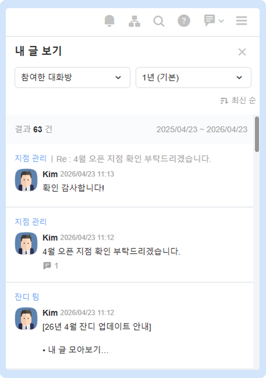내가 작성한 모든 메시지와 댓글을 토픽 단위로 묶어 한 화면에서 확인할 수 있습니다.
