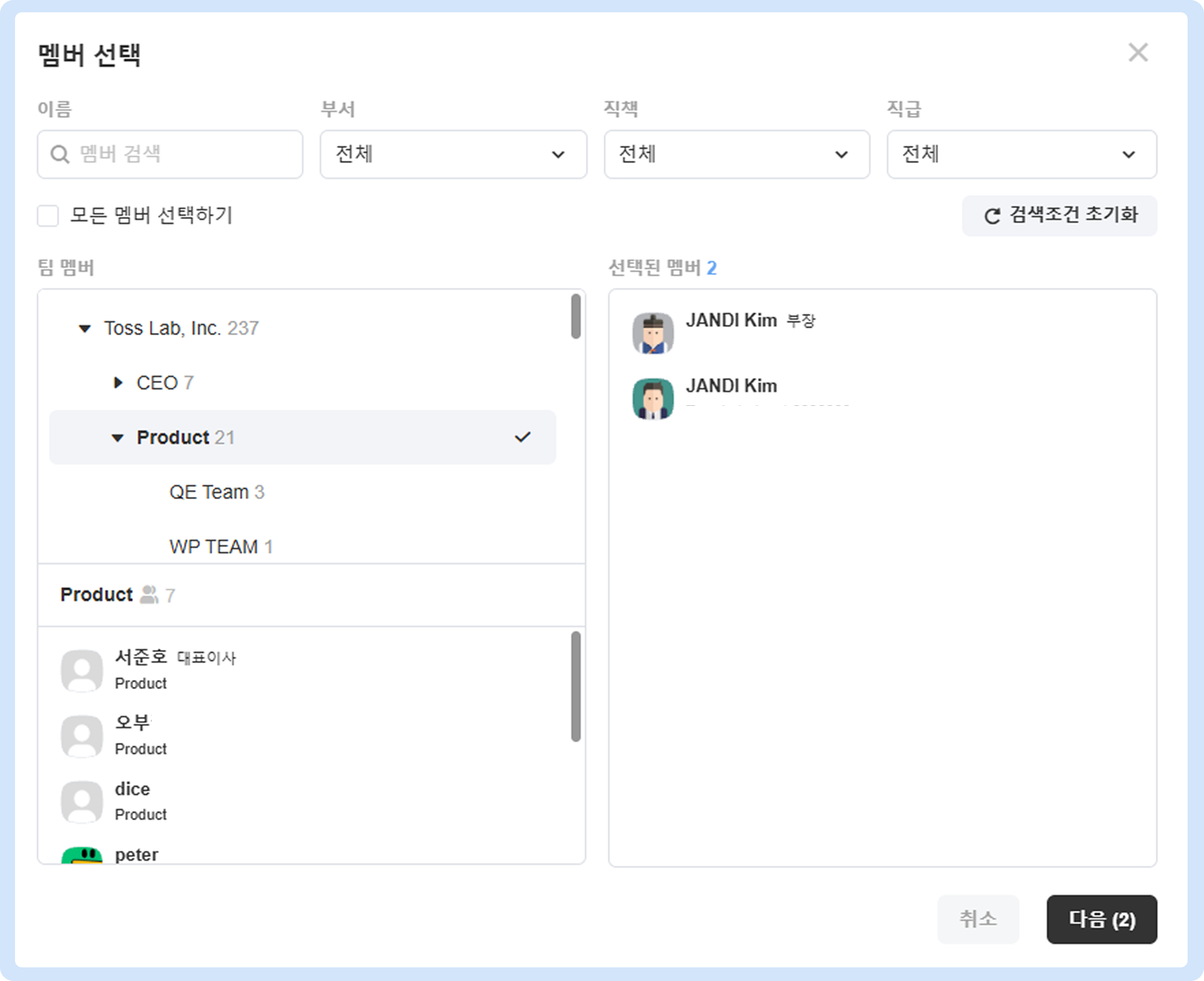 이름, 부서, 직책, 직급으로 검색하여 초대할 멤버를 모두 선택합니다.