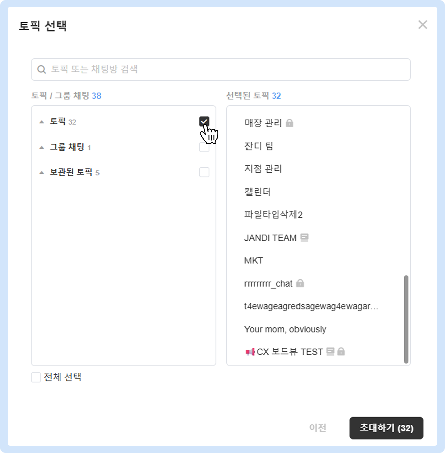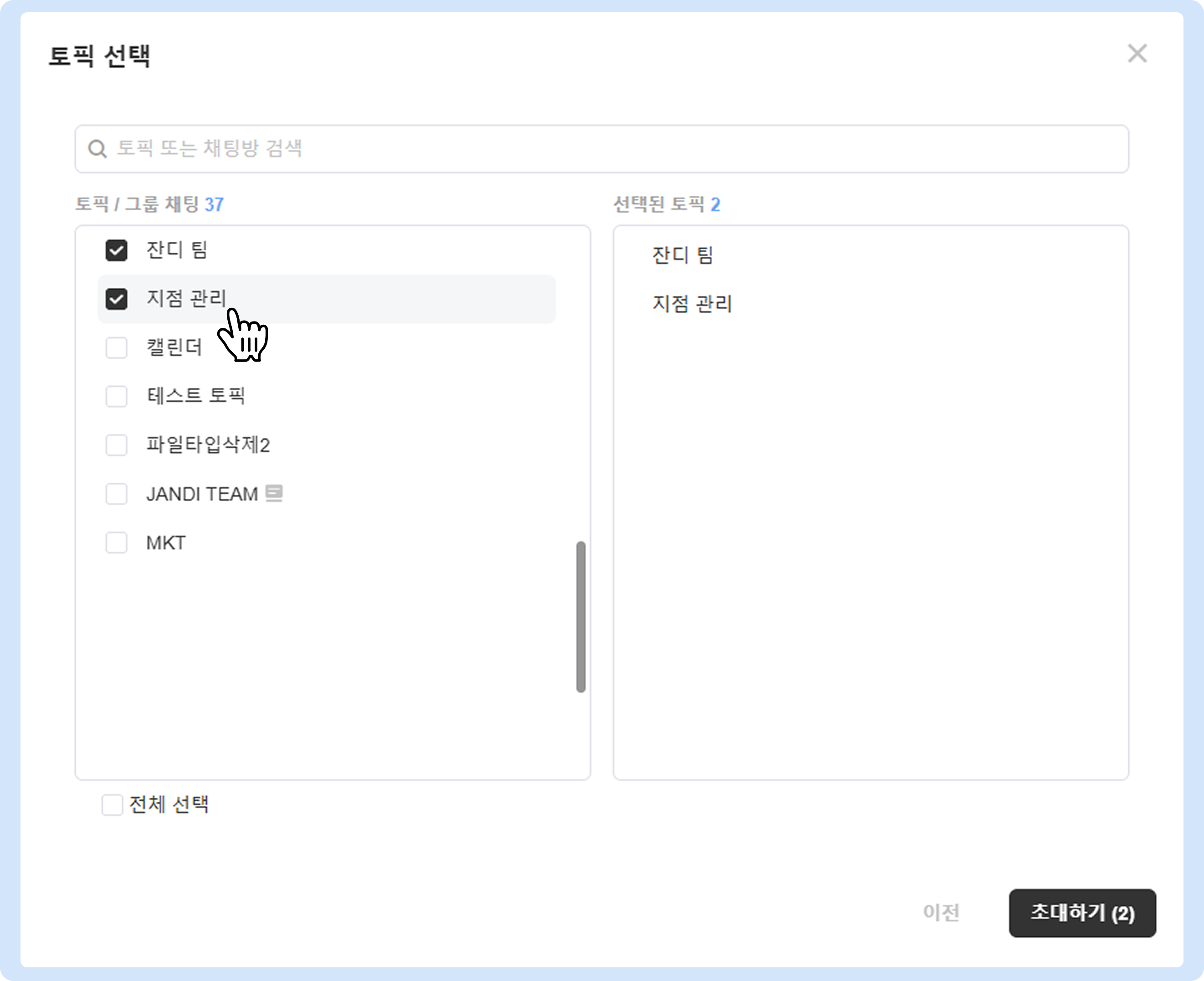 (여러 토픽에 초대 기능은 PC에서만 사용 가능합니다.)