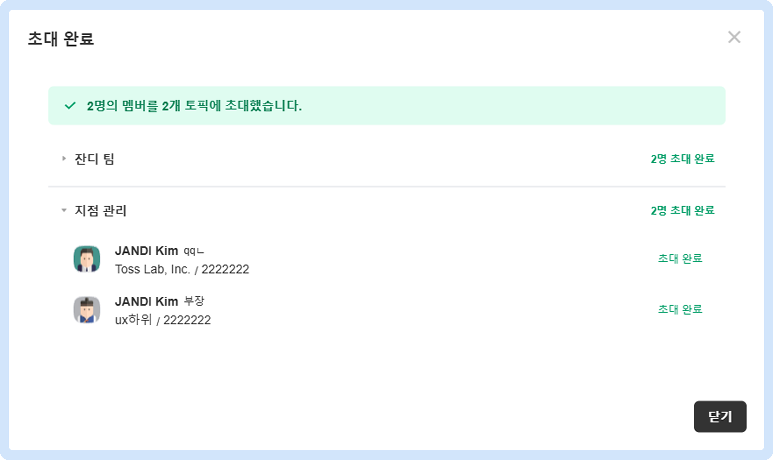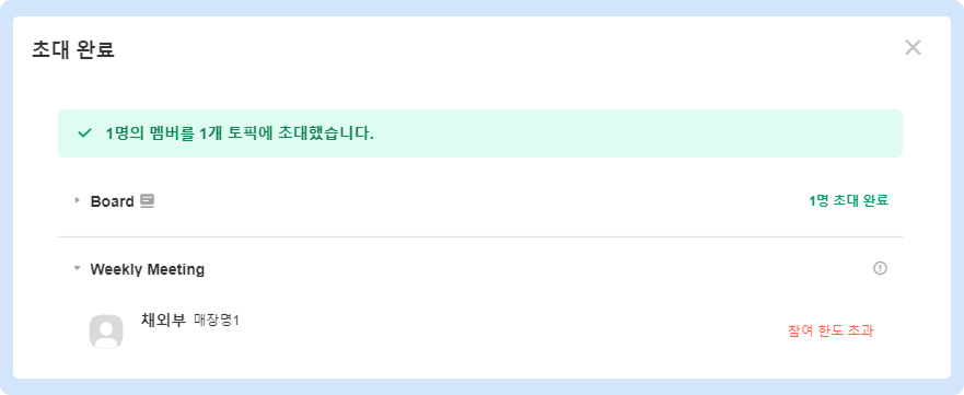 초대 완료 화면에서 어떤 토픽에 초대가 완료되었는지 확인 가능합니다.