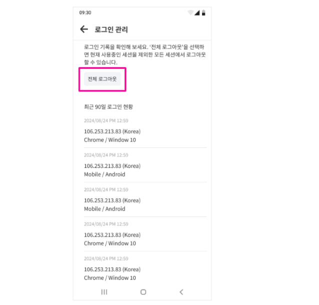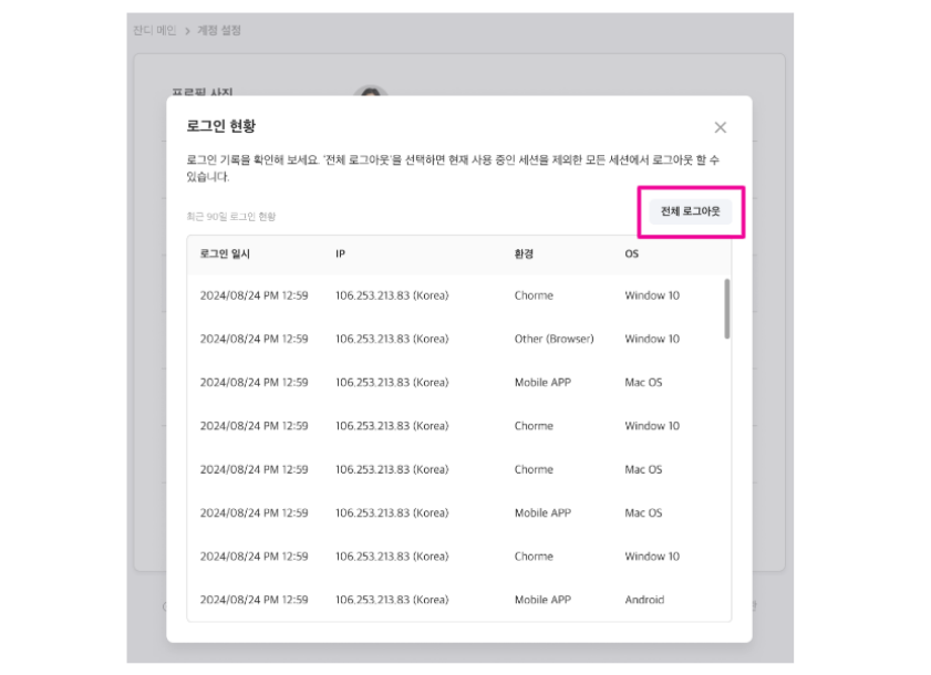 3. 로그인 현황 확인 및 우측 상단의 [전체 로그아웃]