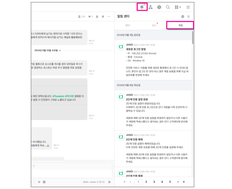 참여 중인 모든 팀에서 동일한 내용으로 알림센터 > 계정 알림을 확인하실 수 있습니다.