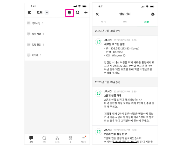 새로운 로그인 알림, 2단계 인증 설정/해제 알림을 받아볼 수 있으며,