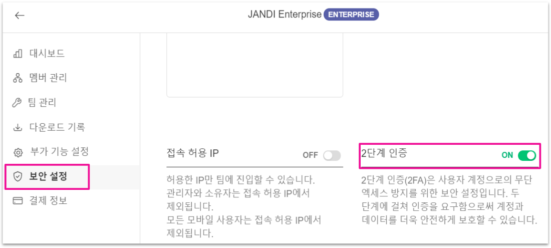 관리자 메뉴에서 팀에 2단계 인증을 적용할 수 있으며, 2단계 인증을 완료한 멤버만 팀에 접근 가능합니다. (Enterprise 플랜 적용 기능)