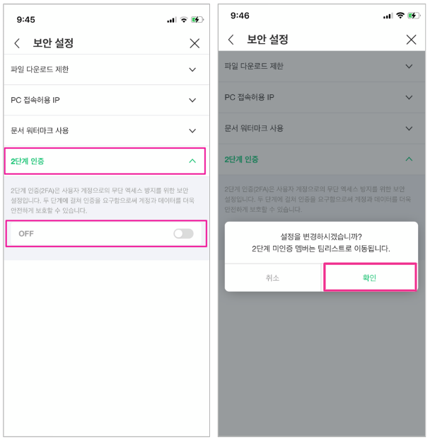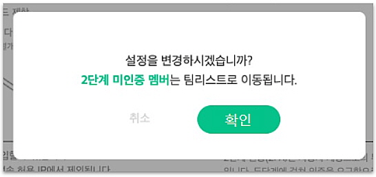 2단계 인증 설정 ON 시, 미인증 멤버는 팀에서 팀 리스트로 자동으로 이동됩니다. 미인증 멤버는 2단계 인증 설정 후에만, 팀에 접속 가능한 점 꼭 미리 확인해주세요!