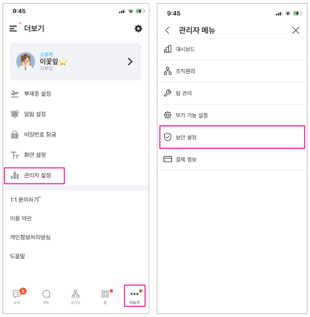1. 모바일 앱 우측 하단 [...] 더보기 > [관리자 설정] > [보안 설정]으로 들어가주세요.