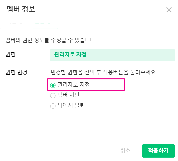cf. (멤버 차단 및 탈퇴 / 관리자 지정 / 소유권 이양) 멤버의 권한 변경 방법이 궁금합니다.