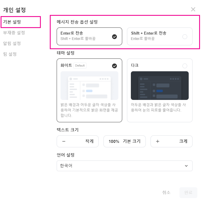 2. [개인 설정] - [기본 설정] - [메시지 전송 옵션 설정]에서 'Shift + Enter로 전송'을 체크하면, Enter로 줄바꿈이 되고 Shift + Enter로 메시지가 전송됩니다.