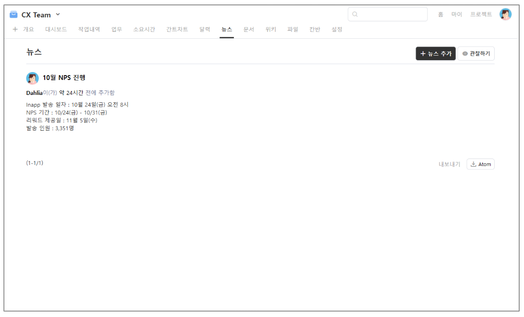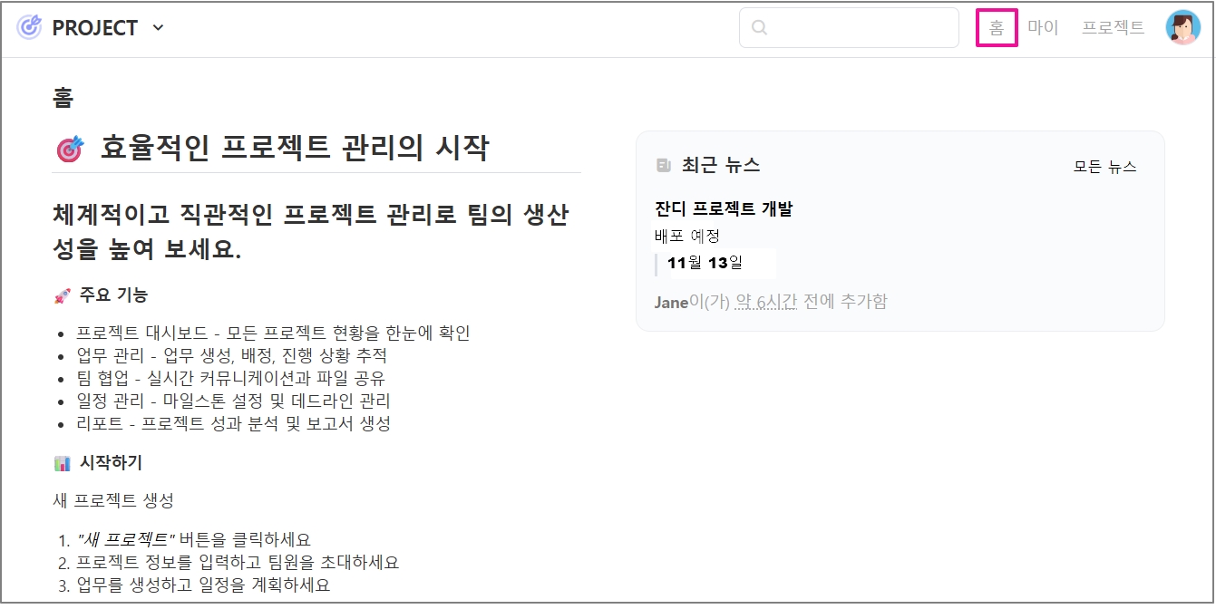 홈 화면 내 최근 뉴스에도 노출되어, 전체 멤버에게 프로젝트 내용을 공지할 수 있습니다.
