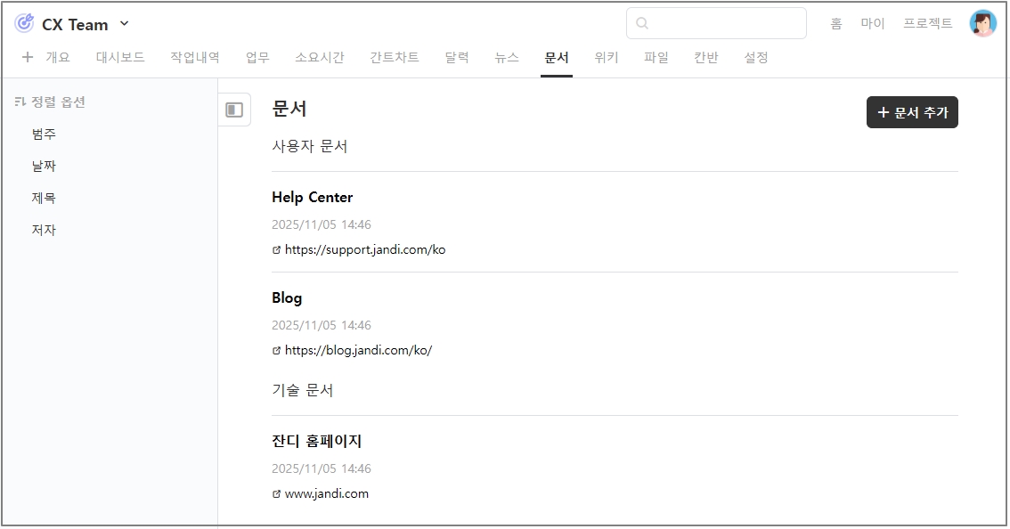 문서 추가 시 범주를 [사용자 문서], [기술 문서] 두 카테고리로 분류할 수 있습니다.