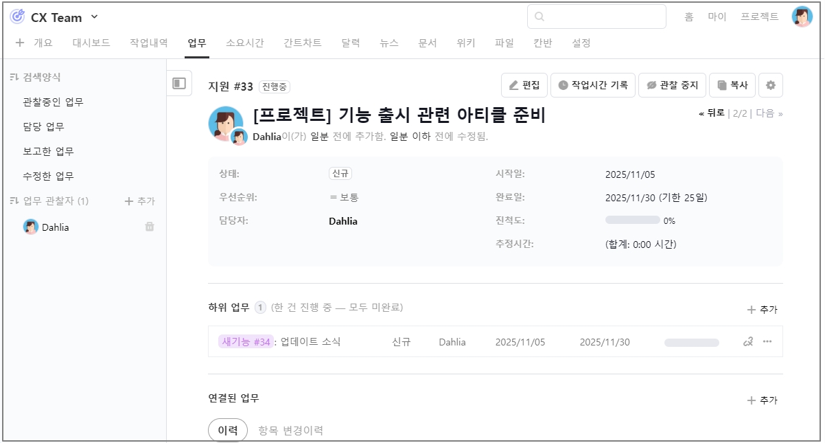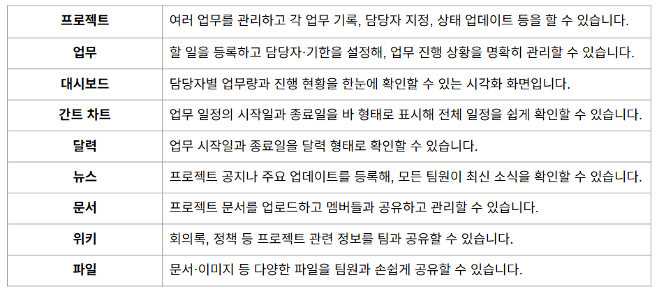 각 업무의 제목, 담당자, 우선순위, 시작일, 마감일, 진행률 등을 설정 및 업무별 상태(신규, 진행 중, 완료 등)를 추적하거나, 댓글과 파일 첨부를 통해 팀원들과 협업 할 수 있습니다.