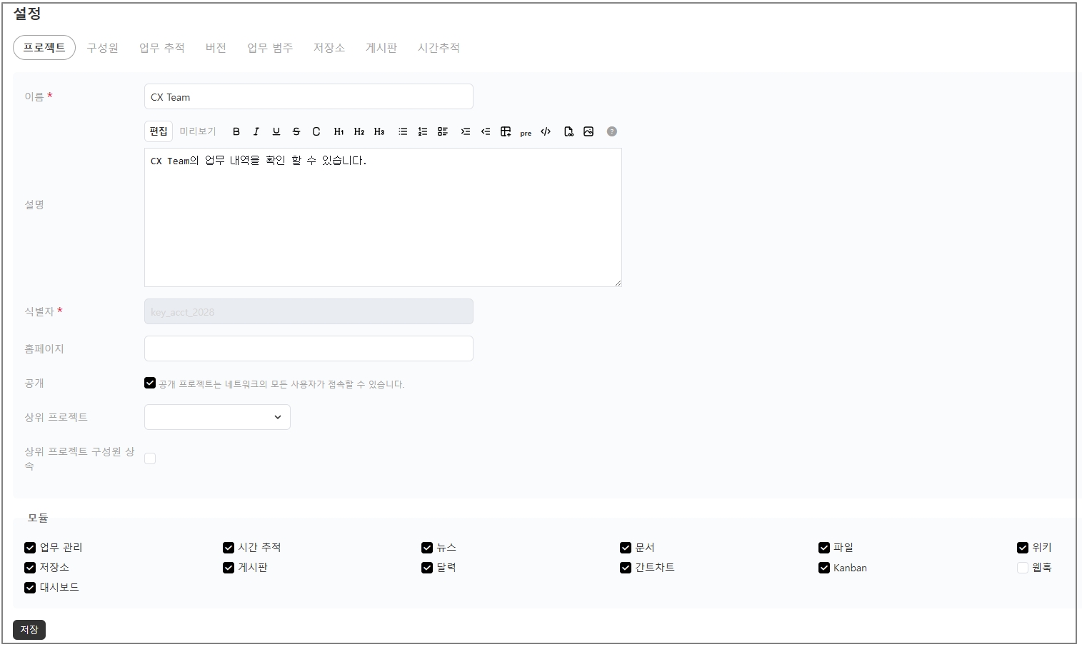 (프로젝트 이름 변경, 모듈 선택, 구성원 추가 및 업무 역할 지정 등)