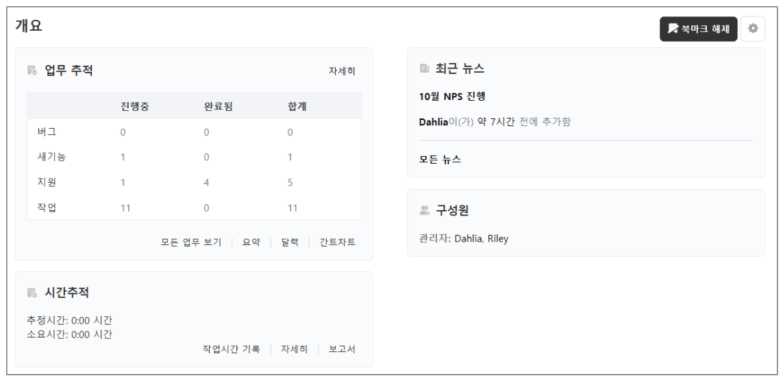 프로젝트 진입 시 첫 화면으로, 프로젝트의 정보가 표시됩니다.
