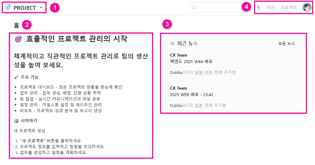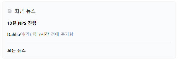각 프로젝트에서 작성한 뉴스가 홈 화면 내 최근 뉴스로 표시됩니다.