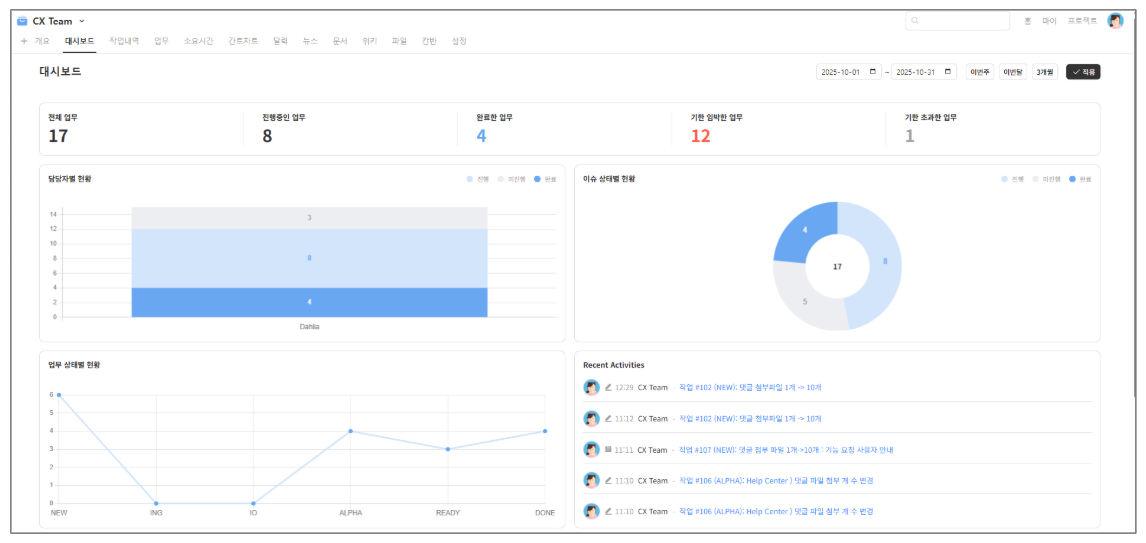 업무 현황을 숫자로 확인하거나, 담당자별 업무량, 업무 상태, 작업 내역을 시각적으로 볼 수 있는 화면입니다.