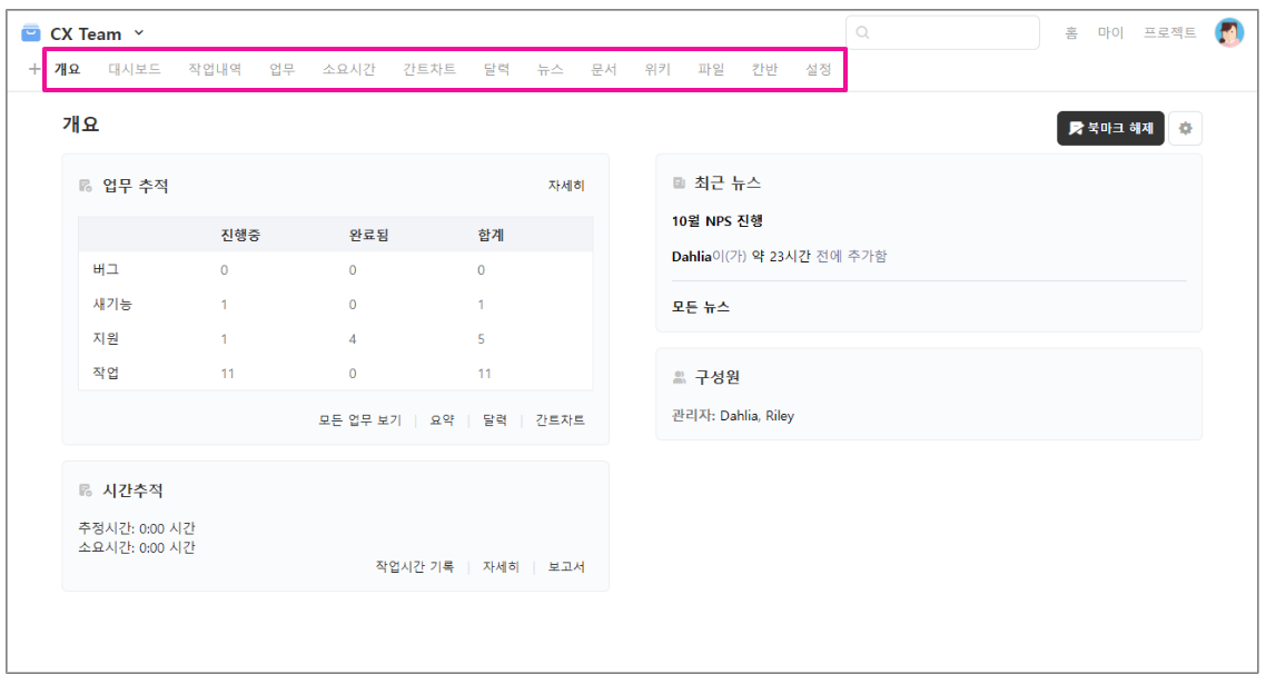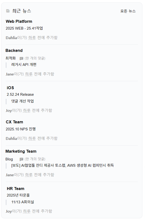 각 프로젝트에서 작성한 뉴스가 홈 화면 내 최근 뉴스로 보입니다.