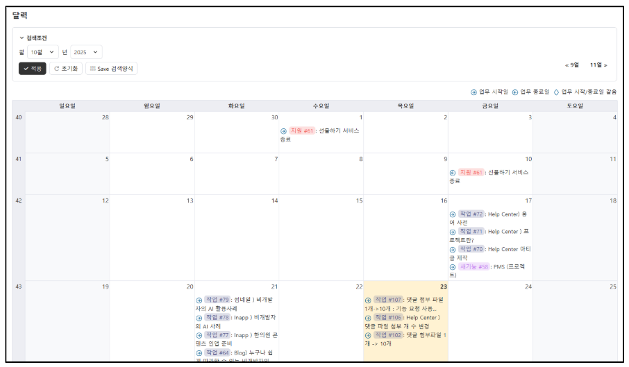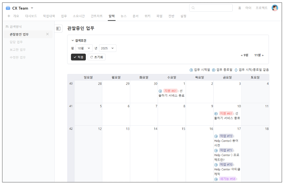 업무 추적 하단의 [달력] 클릭시 달력 형태로 프로젝트 내 모든 업무를 파악하실 수 있습니다.