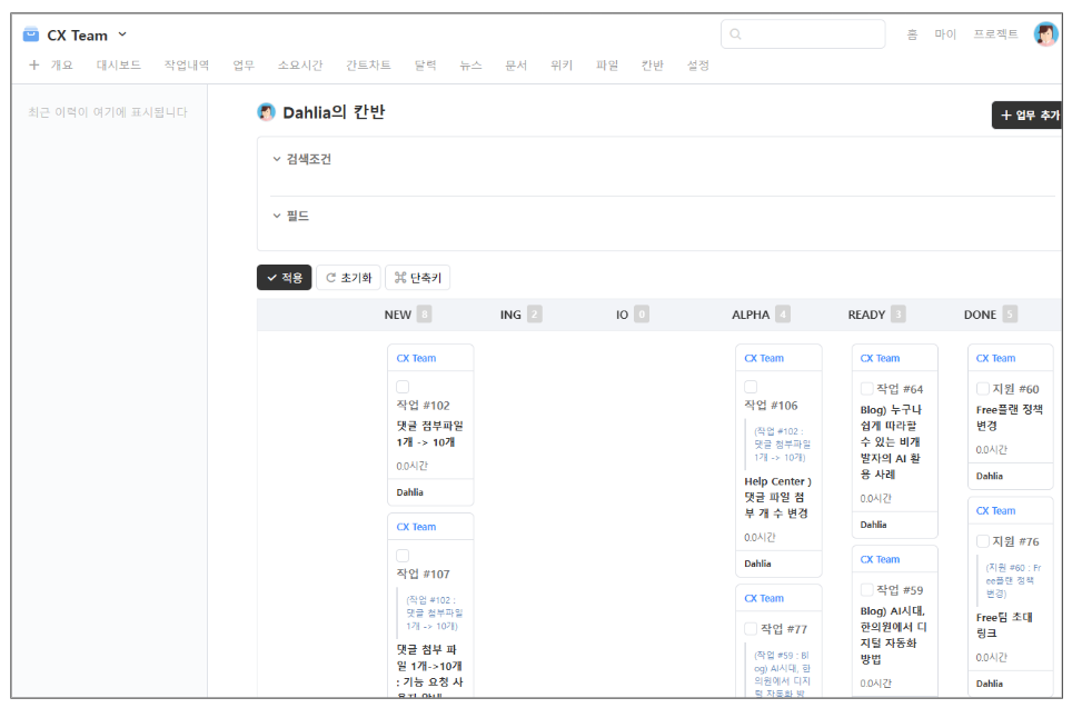 업무의 진행 상태를 열 형태로 구분하여 카드 방식으로 확인할 수 있으며, 각 업무 카드를 드래그 앤 드롭으로 상태를 이동시키며 업무 진행 상황을 관리할 수 있습니다.