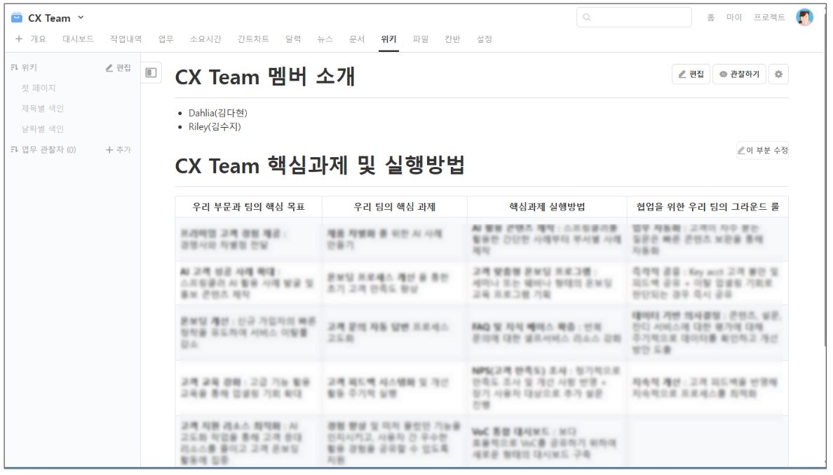 프로젝트와 관련된 정책, 회의록, 프로젝트 목표 등 자유롭게 지식과 정보를 멤버들과 공유할 수 있습니다.