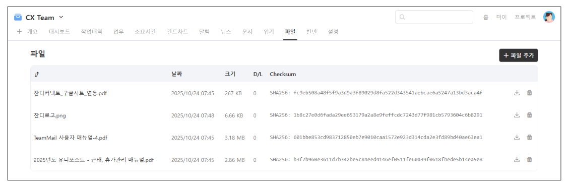 프로젝트 구성원과 공유하고자 하는 문서 파일, 이미지, 개발 파일 등을 업로드할 수 있습니다.