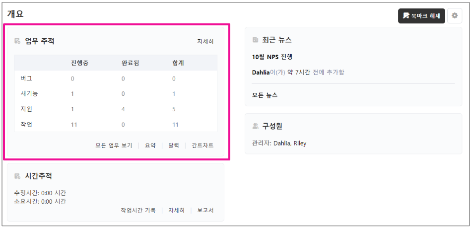 프로젝트 내에서의 업무, 뉴스, 문서, 파일, 위키 등 등록 및 편집 내역을 확인할 수 있습니다.