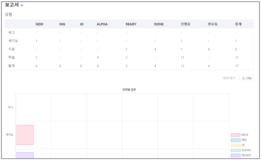 업무 유형별로 진행 중, 완료됨, 합계 건수가 표시됩니다.