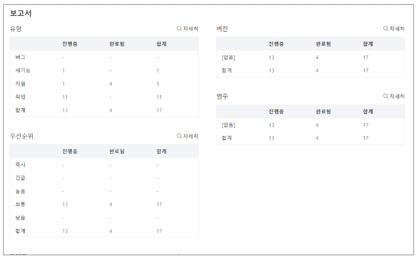 업무 추적 하단의 [요약] 클릭 시 카테고리 별(유형, 버전, 우선순위, 범주, 담당자 상태)로 표 형태로 정리 된 수치를 확인하실 수 있습니다.