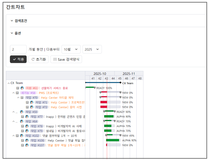 업무 추적 하단의 [간트차트] 클릭시 프로젝트 내 모든 업무를 시각적으로 파악하실 수 있습니다.