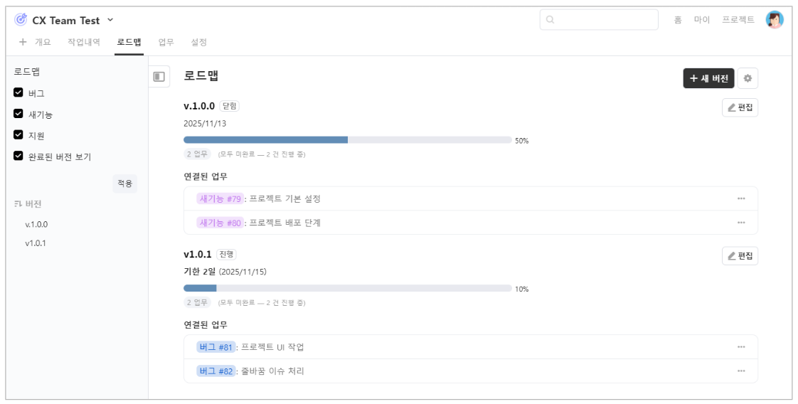프로젝트 단계 별 업무를 파악할 수 있는 기능으로 설정 내 '버전'으로 추가 할 수 있으며,